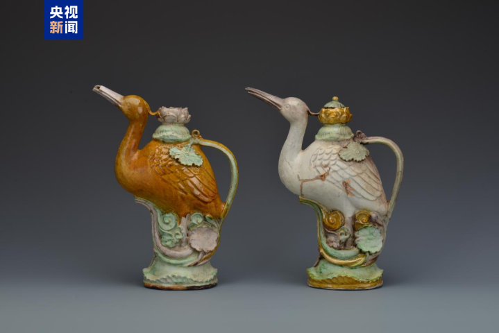 器身整体为鹭形,昂首站立呈鸣啼状,立于莲池之中,以鹭首为流,莲茎为柄,柄肩附一圆形系,鹭背顶有一莲花形壶口,平底。灰白胎,较细腻,胎体厚重。鹭身施黄釉,莲花、花苞施紫釉,两朵如意云纹分别施黄釉和紫釉,荷叶施绿釉,外底无釉。