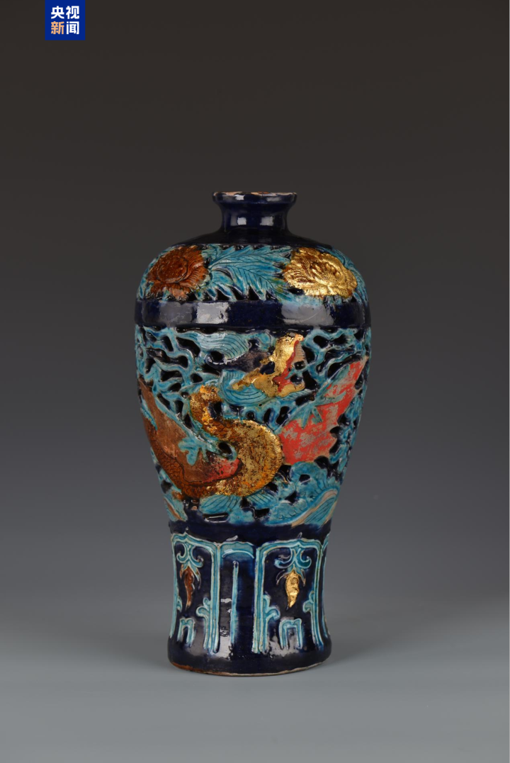 以深蓝色釉铺地,纹饰以浅蓝釉填饰,仰莲纹局部及牡丹、龙身贴金,龙两翼以朱砂绘色。纹饰分为三部分,肩部镂空牡丹花叶纹,牡丹贴金,腹部镂空应龙纹、海水纹,胫部饰仰莲纹。