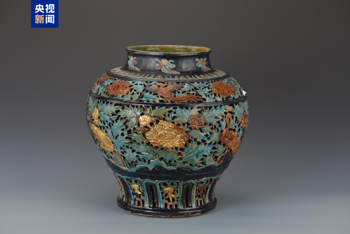 颈部、肩上部沥粉勾勒云纹、覆莲纹各一周,肩下部饰四组凤纹和牡丹纹,花叶镂空,凤及牡丹贴金,腹部饰两组牡丹纹、孔雀纹、仙鹤纹和树石纹,花叶镂空,牡丹、孔雀、仙鹤贴金,胫部饰一周仰莲纹,莲瓣纹内纹饰镂空、贴金,局部以朱砂绘色。器外以深蓝釉铺地,纹饰以浅蓝、黄等色釉填饰。该罐器形较大,罐内密集码放白釉小杯。