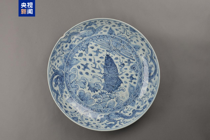 内腹部绘翼龙纹,鲤鱼和翼龙周身饰如意云、“壬”字形和海浪纹,内底双圈内绘鲤鱼跃龙门图,两组纹饰以海浪纹间隔。