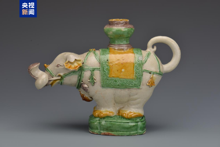 器身整体为象形,象鼻卷曲上扬为流,象尾卷曲为柄,背披鞍垫,其上托宝瓶形壶口,缰绳于背部系结,结为花形,缰绳上挂多处装饰,象颈挂圆形铃铛,四足并拢直立。